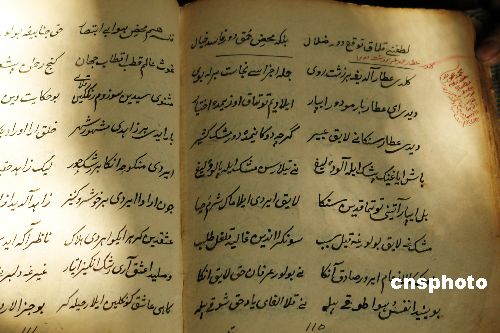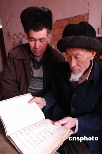 1月13日,吐魯番鄯善縣魯克沁鎮宗教人士在翻閱察合臺語長篇敘事詩《熱吾澤突孜左合熱》手稿。2006年新疆吐魯番地區少數民族古籍工作人員,在新疆鄯善縣魯克沁鎮兩位宗教人士手中,先后發現古西域著名維吾爾族詩人艾合買提·吾加木尼牙孜在1802年,用察合臺語(古維吾爾語)創作的長篇敘事詩《熱吾澤突孜左合熱》(漢譯:左合熱的文明園)手稿,和清代西域維吾爾族學者吾布勒·伊斯拉木,從波斯語翻譯為察合臺語(古維吾爾語)的抄本《麥魯麻提阿帕克》(漢譯:世界通訊)。這兩本古籍對研究古西域文學、歷史、地理和古絲綢之路文明具有重要意義。目前,這兩本古籍已經列入國家珍貴古籍名錄。中新社發 姜浩 攝