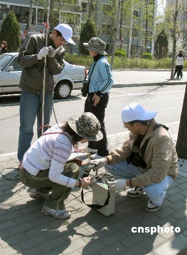 4月3日,北京林業(yè)大學(xué)氣象專業(yè)研究生在西城區(qū)甘家口街旁利用儀器,實(shí)習(xí)監(jiān)測(cè)地面高度四至五米高度的空氣質(zhì)量。據(jù)操控儀器的學(xué)生介紹,測(cè)量是為了采集畢業(yè)論文數(shù)據(jù),當(dāng)日所檢測(cè)到的數(shù)據(jù)值均為良好。據(jù)北京市環(huán)境保護(hù)監(jiān)測(cè)中心日前發(fā)布的消息,3月份北京市收獲了19個(gè)藍(lán)天,使一季度空氣質(zhì)量達(dá)標(biāo)天累計(jì)達(dá)67天,占73.6%,比去年增加了12天,為九年來(lái)歷史同期最好水平,空氣質(zhì)量的改善,林木覆蓋率的增加,見(jiàn)證了北京對(duì)綠色奧運(yùn)的承諾。 中新社發(fā) 鄒憲 攝