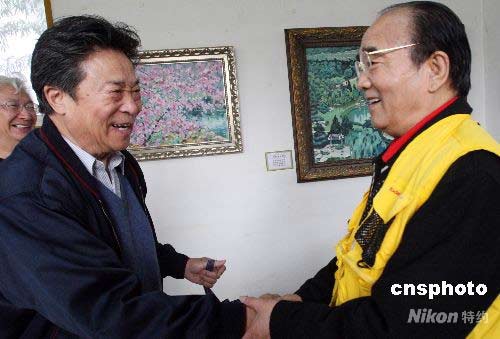 4月15日,以北京植物園景觀(guān)為專(zhuān)題的“王石之油畫(huà)展”在植物園盆景園內(nèi)開(kāi)幕,是次畫(huà)展是由曾畫(huà)毛澤東巨像的中國(guó)著名畫(huà)家王石之創(chuàng)作完成,展出的40幅油畫(huà)都是以一畫(huà)一景的形式從植物園的春天到冬天不同季節(jié),不同區(qū)域的自然風(fēng)光、園林美景、人文古跡等優(yōu)美景觀(guān)。圖為李光曦(左)與高占祥出席開(kāi)幕式。中新社發(fā) 錢(qián)興強(qiáng) 攝