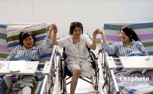 7月2日,三名四川綿竹東汽中學的考生在重慶新橋醫(yī)院熟悉考場。3日,她們將在重慶參加高考四川延考區(qū)的考試。三位同學中有兩位腰、腿有傷,另一名同學高位截肢,她們將在病床、輪椅上答題。中新社發(fā) 曾理 攝
