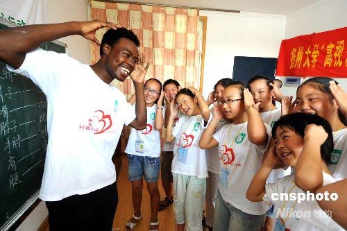 7月10日,揚州大學藝術學院的外教羅伯特,正在給地震災區孩子進行暑期夏令營授課。當日,揚州大學藝術學院、體育學院、教育科學學院以及外國語學院的20余名師生,為來自四川地震災區的67名學生舉辦“真情傳遞、愛心永恒”素質拓展夏令營活動,幫助他們開闊視野、豐富知識、拓展素質。中新社發 顧亮亮 攝