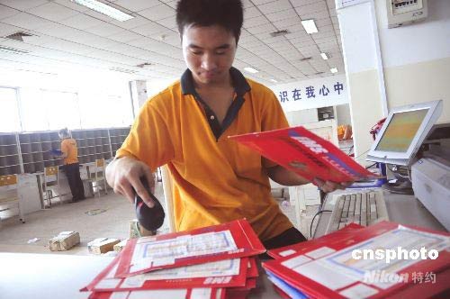 7月18日,河南省南陽市郵政速遞局的工作人員在用掃描儀讀取高考錄取通知書的“電子身份證”,以備輸入電腦進行長效監管。 據悉,每份高考錄取通知書均被編排了全國唯一的電子信息,由9位數字和4位字母組成,俗稱高考錄取通知書的“電子身份證”。這即便于速遞工作人員在運輸、分揀和投遞等環節實時跟蹤和監控,也便于收件人隨時進行查詢,以確保高考錄取通知書準確快捷地投遞。 該局還對高考錄取通知書實施單袋單封、本人按址持證簽收等措施,保證了每年所投遞的5萬3千份高考錄取通知書無一例出現差錯。中新社發 付海厚 攝