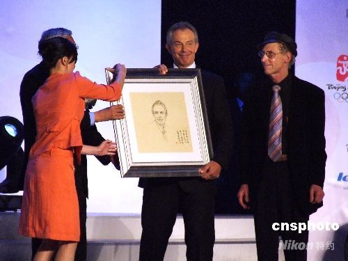 8月4日,由北京大學主辦的“2008奧運.冠軍論壇”在北京大學百年紀念講堂內(nèi)隆重開幕。出席開幕盛典的貴賓有英國前首相托尼.布萊爾、成龍、譚盾、揚揚、羅雪娟在內(nèi)的數(shù)十位中外嘉賓。圖為北京大學校長許智宏向英國前首相托尼.布萊爾贈送畫像。中新社發(fā) 鄭雄增 攝