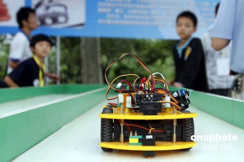 9月18日,第十屆中國科協年會科普主題廣場活動在鄭州綠城廣場舉行。當日鄭州中學生在測試機器人的行走情況。中新社發 慎重 攝