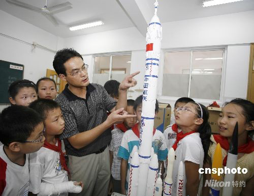 9月24日,江蘇省無錫市揚名中心小學的航天興趣小組在活動室里研究神舟系列飛船模型。“神七”飛天在即,該校航天興趣小組通過組裝航天模型,學習飛船發射原理,在校園中掀起學習航天知識熱潮。中新社發 張浩 攝