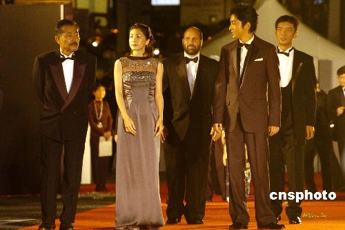 圖為開幕影片《夜鷹》男女主演大澤takao(前右)和竹內(nèi)結(jié)子(前中)、導(dǎo)演成島出(前左)經(jīng)紅地毯步入開幕式會場。