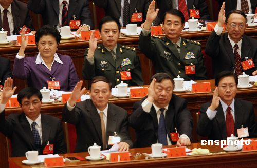 中國共產黨第十七次全國代表大會10月21日上午在北京人民大會堂閉幕。大會在選舉產生新一屆中央委員會和中央紀律檢查委員會后,以舉手表決的方式通過關于十六屆中央委員會報告的決議、關于中央紀律檢查委員會工作報告的決議、關于《中國共產黨章程(修正案)》的決議。中新社發 任晨鳴 攝