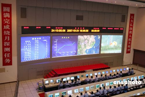 十月二十四日傍晚,中國首顆月球探測衛星——嫦娥一號發射成功。圖為北京航天飛行控制中心監控衛星發射情況。中新社發 毛建軍 攝