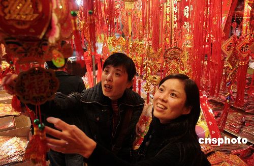 十二月三十一日,為了迎接新年,福建泉州購買喜慶用品的市民絡(luò)繹不絕,市場熱鬧非凡。“爆竹”掛件、彩燈、“中國結(jié)”等的銷售異常火爆,家家戶戶都將自家里里外外裝點(diǎn)一新迎接新年。中新社發(fā) 傅丹丹 攝