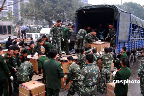 2月4日,雪凝天氣尚未結束,貴陽地區又飄起了毛毛細雨,在省政府廣場上,武警戰士在裝運重慶等省市支援貴州的救災物資和小型發電機,準備運往此次雪災中受災嚴重的黔東南、黔南、銅仁、畢節等地區。此次持續20多天的雪凝凌凍天氣,使貴州省70多個縣市受災嚴重,部分縣市停水斷電已近20天。中新社發 歐陽昌佩 攝