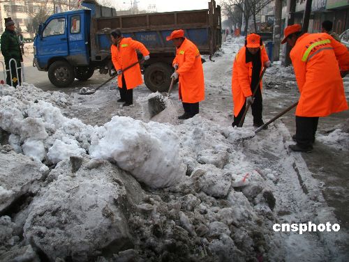 2008年2月7日,大年初一,安徽蒙城縣環衛工人放棄休息,對市區主要道路人行道上的積雪進行清理,以辛苦勞動為歡度春節的市民營造良好的出行環境。中新社發 胡衛國 攝