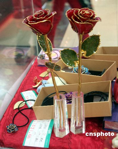 2008年2月13日,“情人節(jié)”前夕,遼寧省沈陽市中街一商廈售價(jià)521元的金玫瑰花面市。中新社發(fā) 劉寶成 攝