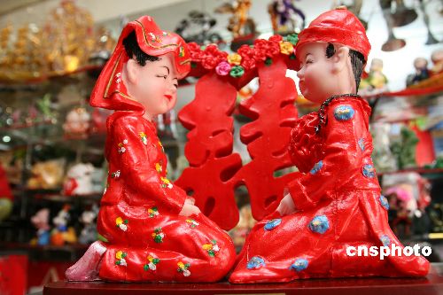 2月13日,河南許昌某商店拍攝的具有民俗特色的“情侶”飾品。情人節前夕,許昌一些商家推出造型別致的“情侶”飾品,既符合“情人節”浪漫情調又具有民俗特色,深受人們喜愛。中新社發 牛書培 攝