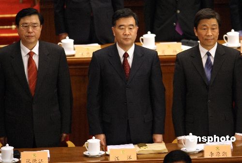 3月3日下午,全國政協十一屆一次會議在北京人民大會堂開幕,中共中央政治局委員李源潮、汪洋、張德江(從右至左)出席。中新社發 任晨鳴 攝