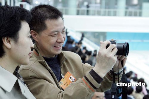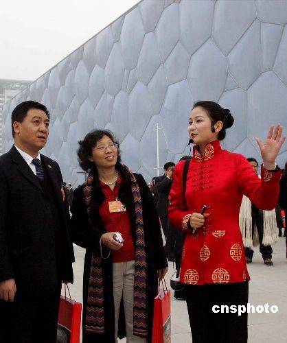 三月十二日下午,部分全國政協委員參觀北京奧運場館。圖為委員們在國家游泳中心“水立方”參觀。中新社發 潘索菲 攝