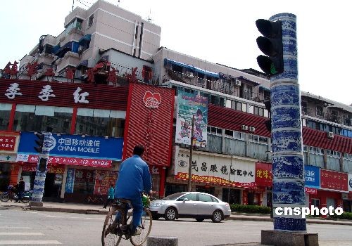 3月20日,“清明上河圖”瓷器紅綠燈亮相景德鎮市街頭。該燈為白底青花圖案,畫面內容是清明上河圖,直徑0.5米,高4.2米。樹立在在景德鎮新廠的瓷器紅綠燈不但能指揮交通,美化城市,同時正逐漸成為景德鎮鮮明的瓷文化標志符號之一。中新社發 石衛明 攝