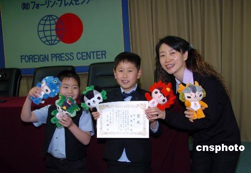 年僅9歲的東京都市立小學二年級學生布施望(中)以《五環(huán)夢》為題的漢語作文獲得學生組一等獎。中新社發(fā) 段躍中 攝