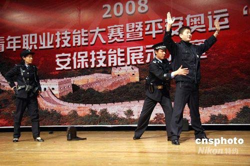 以“迎奧運、比技能、促振興”為主題的2008沈陽青年職業(yè)大賽開幕式暨奧運安保技能展示大賽4月24日在沈陽舉行。這次大賽充分展示沈陽市公安民警關(guān)注奧運、參與奧運、奉獻(xiàn)奧運的精神風(fēng)貌,通過比賽將全面提升奧運安保人員的綜合素質(zhì)、執(zhí)法能力和實戰(zhàn)能力,打造一支高效率、高水平、符合奧運規(guī)則、體現(xiàn)國際水平的安保服務(wù)隊伍,確保沈陽賽區(qū)足球比賽順利進(jìn)行。中新社發(fā) 趙敬東 攝