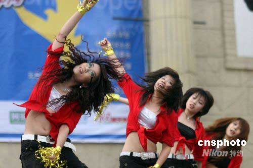 2008年“五一”期間, 2008“中網·網動中國”網球拉拉隊團體復賽在北京歡樂谷舉行。來自北京十幾所高校的拉拉隊選手參加了比賽,進入前三名的選手將取得2008中國網球公開賽拉拉隊的資格。中新社發 陳曉根 攝