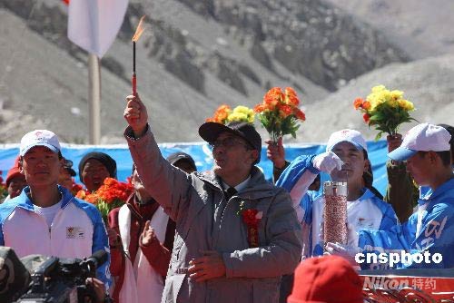 西藏自治區(qū)政府主席向巴平措用點火棒從珠峰火種燈中引燃圣火。 中新社發(fā) 盛佳鵬 攝