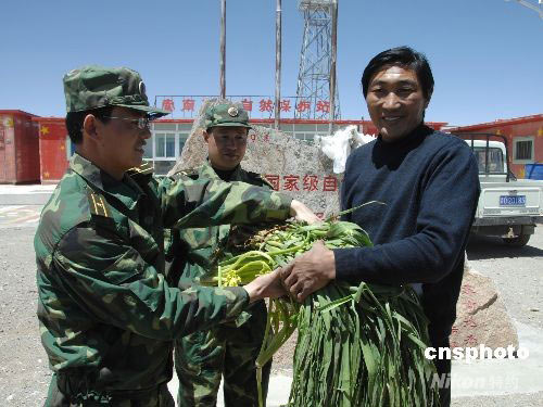 5月10日,青藏高原行車的中國汽車兵路過位于青海省可可西里國家自然保護區的索南達杰保護站,把新鮮的蔬菜和副食品送到工作人員手中。中新社發 吳蘇琳 攝