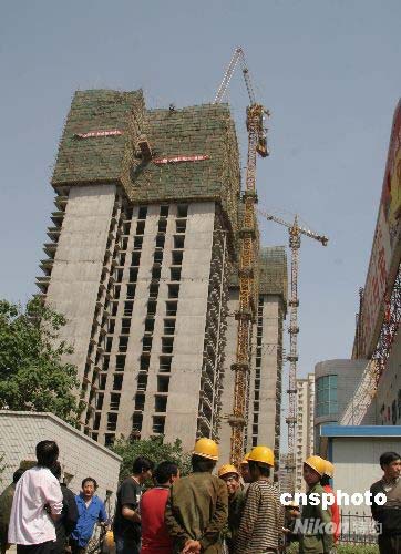 西安感覺強烈震感,一個正在施工的建筑工地吊塔在高空被震斷,操作員當場摔下身負重傷,其他建筑工人被緊急疏散。目前傷員正在醫院搶救,尚未脫離生命危險。中新社發 王振001 攝