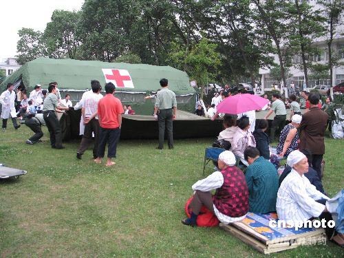 四川汶川縣發(fā)生7.8級(jí)地震。成都受到波及,也發(fā)生5.4級(jí)地震。位于成都北郊的成都軍區(qū)總醫(yī)院接收了來自地震災(zāi)區(qū)的100多名傷員。在積極組織搶救的同時(shí),醫(yī)院搭建10余頂大型帳篷,將住院的1000多名患者全部安全轉(zhuǎn)移。中新社發(fā) 朱琥 攝