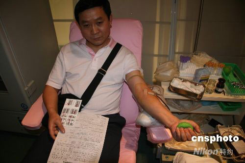 5月12日晚7時許至13日凌晨,數千成都市民前往市內各獻血點獻血,為四川地震災區的人們獻上愛心。圖為田先生在林蔭街武侯愛心獻血屋獻血。 中新社發 楊杰 攝