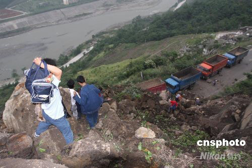 5月12日14時28分,四川汶川縣(北緯31度,東經(jīng)103.4度)發(fā)生7.8級地震,離都江堰市區(qū)5公里的水井灣大橋發(fā)生大面積塌方,通往汶川的道路全線阻擋。圖為困在塌方區(qū)域的居民前往安全區(qū)域。 中新社發(fā) 黃榮 攝