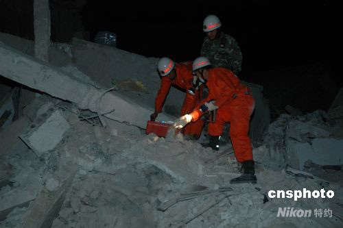 12日下午2:30左右,受四川汶川地震波及,重慶市梁平縣文化鎮一小學教學樓發生垮塌。13日凌晨1時許,記者從梁平縣政府辦公室獲悉,目前搜救工作已全部結束,垮塌造成5人死亡,36人受傷。圖為消防人員正利用生命探測器對廢墟下的傷員進行探測。 中新社發 郭虹 攝