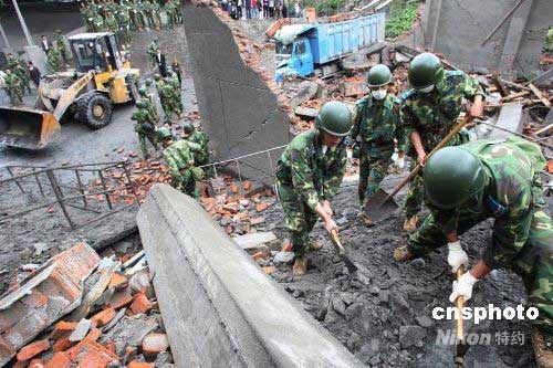 5月14日,在四川救災的空降兵某部正在清理什邡市洛水鎮水泥廠廢墟。