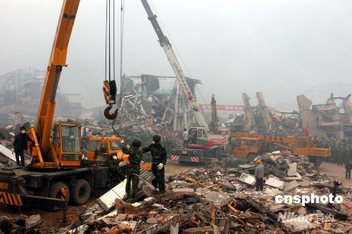 5月14日,在四川什邡市救災的空降兵某部官兵用重型機械清理地震廢墟現場。
