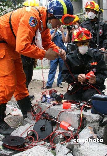 圖為救援隊在現場調試裝備。中新社發 齊彬 攝