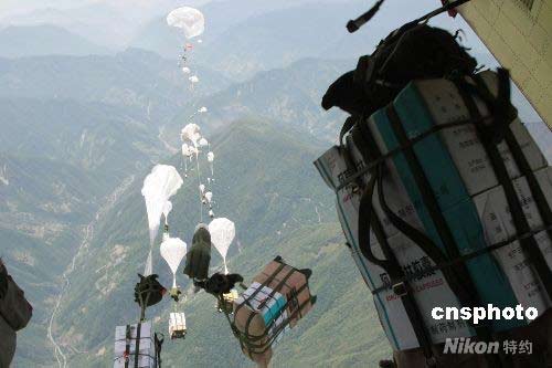 5月16日,中國空軍航空兵某師在向四川地震災區空投救災物資。空軍發揮空中運輸優勢,連續出動大型運輸機,不間斷大規模向四川災區投送災民急需的藥品、食物、帳篷等急需的生活用品。中新社發 譚超 攝