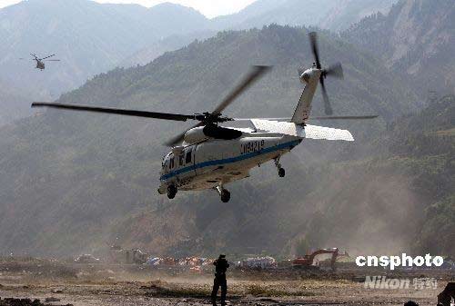 5月19日,中國空軍繼續高密度對四川省汶川大地震核心重災區映秀鎮空運救災物資與部隊急需的飲用水等給養。中新社發 任晨鳴 攝