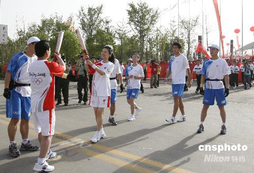 5月29日上午7時,奧運火炬接力安徽的傳遞活動在“能源之都”淮南傳遞;茨霞胍曋鞒秩酥軡齻鬟f火炬第一棒。中新社發 張婭子 攝