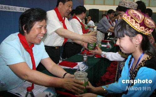 圖為《航天員》雜志編委會副主任孫錦云(左一)向維吾爾族小營員贈送一份特殊的兒童節禮物——一顆搭載遨游過太空的花卉種子。中新社發 孫自法 攝