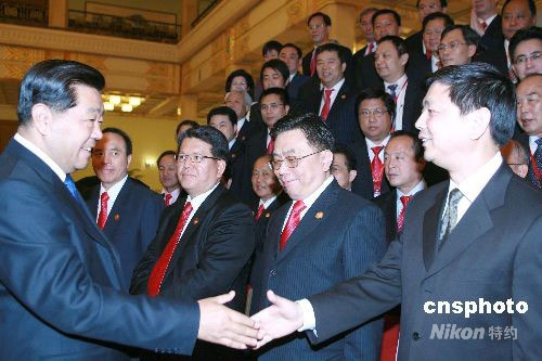 6月2日,全國臺灣同胞投資企業聯誼會(臺企聯)一屆二次會議在北京人民大會堂舉行,中共中央政治局常委、全國政協主席賈慶林出席會議并與參會代表合影留念。中新社發 廖文靜 攝