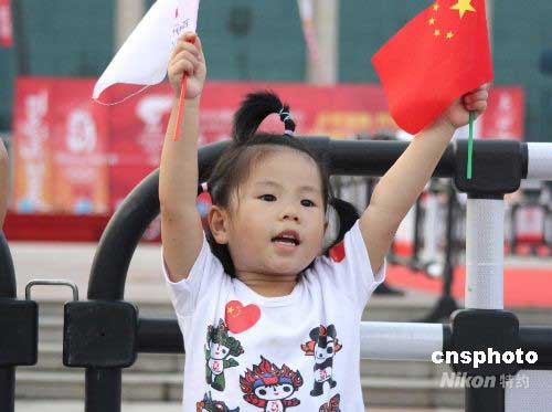 廣西南寧一位小朋友在民族廣場為即將到來的奧運火炬歡呼。中新社發 劉萬強 攝