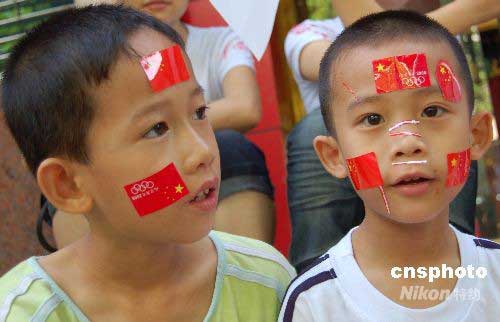 兩名臉上貼著國旗圖案的少年在迎接奧運圣火的到來。中新社發 劉萬強 攝