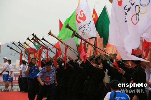 當地瑤族民眾吹響獨特的瑤族長號迎接奧運圣火。 中新社發 周兆軍 攝