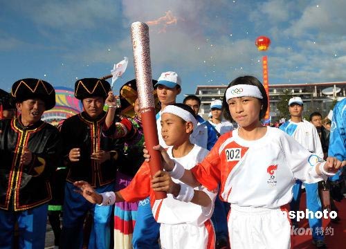 6月10日,奧運(yùn)圣火在云南麗江開(kāi)始傳遞,四川汶川地震孤兒張紫蘭(右)與云南麗江地震孤兒和震生共同傳遞首棒火炬。1996年,云南麗江曾發(fā)生7級(jí)地震。中新社發(fā) 廖攀 攝