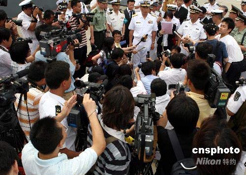 中日海軍高級將領在湛江碼頭接受者采訪
