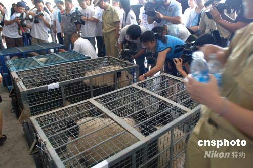 6月24日下午,4只來自四川臥龍的受災大熊貓抵達福州熊貓世界。這也是“5·12”汶川大地震發生后,除運往北京的8只“奧運熊貓”外,臥龍正式向外省轉移安置的首批大熊貓。中新社發 鄭祚聲 攝