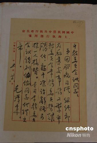 這是中國國民黨黨史館館藏的一九二四年毛澤東致平教委員會諸同志的一封親筆信。中新社發 耿軍 攝