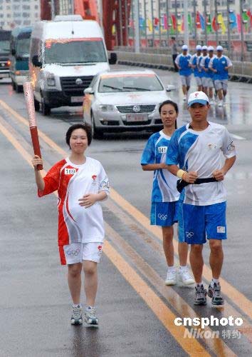 7月15日下午,奧運火炬在吉林市傳遞,已經懷孕7個月的火炬手李圓傳遞火炬。 中新社發 廖攀 攝