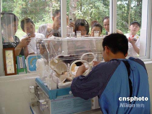 圖為游客透過窗戶觀看人工飼養熊貓幼仔。7月6日早晨7點52分和8點36分,臥龍大熊貓“幗幗”在發情配種119天后,順利產下一對雙胞胎,這是5.12汶川大地震后在中國保護大熊貓研究中心雅安碧峰峽基地出生的第一對雙胞胎,也是全世界今年出生最早的大熊貓寶寶。地震時,“幗幗”的圈舍嚴重被毀,她受到嚴重驚嚇,逃逸出圈外,后研究中心工作人員將其找回。中新社發 羅小韻 攝