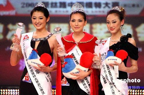 7月19日晚,2008新絲路模特大賽浙江賽區總決賽在浙江杭州舉行。15名女選手經過激烈角逐,最后30號選手章建麗(中)、15號選手由倫娜(左)、12號選手李建楠(右)分別奪得冠亞季軍。她們三人將代表浙江參加全國總決賽。中新社發 袁云 攝