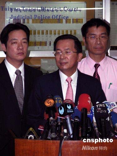 7月21日上午,臺(tái)北地方法院開庭審理臺(tái)灣地區(qū)前領(lǐng)導(dǎo)人陳水扁(中)及民進(jìn)黨籍“立委”賴清德(左)、前“立委”徐國(guó)勇(右)等被控誹謗案,陳水扁首度以被告身份到庭應(yīng)訊。庭審之后,陳水扁與賴清德、徐國(guó)勇在臺(tái)北地院召開記者會(huì)。中新社發(fā) 徐長(zhǎng)安 攝