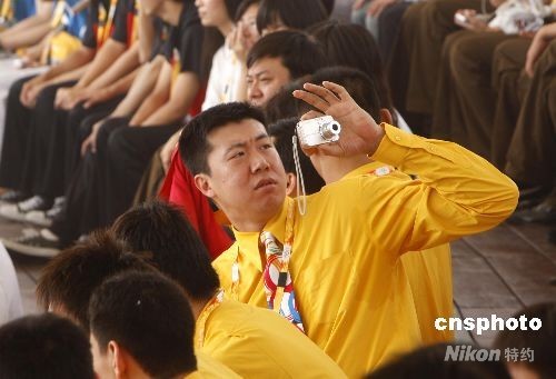 7月27日,北京奧運(yùn)村正式開(kāi)村,中國(guó)籃球隊(duì)隊(duì)員王治郅隨身攜帶了一部照相機(jī),在開(kāi)村儀式上四處捕捉有趣的畫(huà)面留念。中新社發(fā) 杜洋 攝